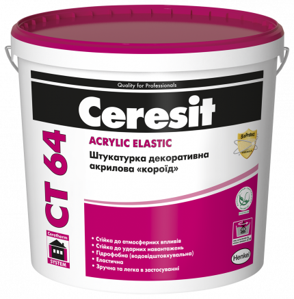 Декоративная акриловая штукатурка Ceresit CT 64 предназначена для декоративной отделки поверхностей внутри и снаружи зданий, по бетонным, подготовленным кирпичным, оштукатуренным основаниям и в системах теплоизоляции фасадов, а также внутри помещений по основаниям из гипса, гипсокартона, древесностружечных плит (после обработки их грунтовками Ceresit CT 17 и Ceresit CT 16). Нельзя применять для отделки цоколя.
