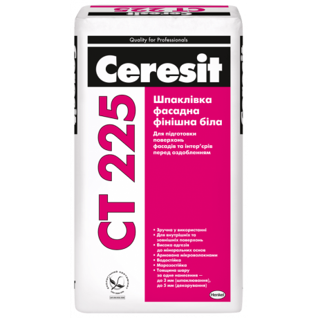 Фасадная шпаклевка Церезит СТ 225 (Ceresit СТ 225) состоит с цементной основы, мелкодисперсных наполнителей, полимерных добавок и армирующих волокон. Применяется она в основном для подготовки различных поверхностей под финишную отделку и для ремонта различных трещин и выемок раковин глубиной до 3 см. Обрабатывать шпаклевкой Ceresit СТ 225 можно бетонные, кирпичные и цементно-песчаные основания. Она достаточно удобная, подходит для внешних и внутренних работ, стойкая к внешней среде и экологически безопасная.