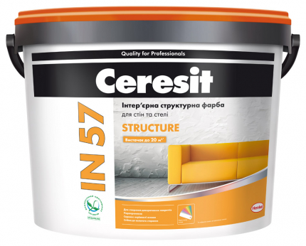 Интерьерная структурная краска Ceresit IN 57 STRUCTURE База А состоит из водной дисперсии стирол-акриловой смолы с минеральными наполнителями и пигментами. Используется для декоративной отделки стен и потолков внутри зданий. Краска наносится как на минеральные (например, гипсовые штукатурки и плиты), так и на органические (например, обои, стеклохолст, пенополистирольные плиты, фанера, древесностружечные и древесноволокнистые плиты) основания. Можно применять для отделки ранее окрашенных поверхностей.
