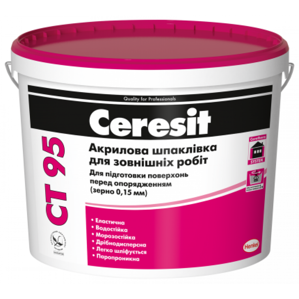 Финишная акриловая шпаклевка Ceresit CT 95 (зернистостью 0,15 мм) предназначена для финишной подготовки поверхности под отделку. Наиболее эффективна на поверхностях с низкой прочностью и высокой впитывающей способностью. Данная шпаклевка имеет размеры зерна, не более 0,15 мм. Шпаклевка поставляется в пластиковых ведрах, объемом 10 л.