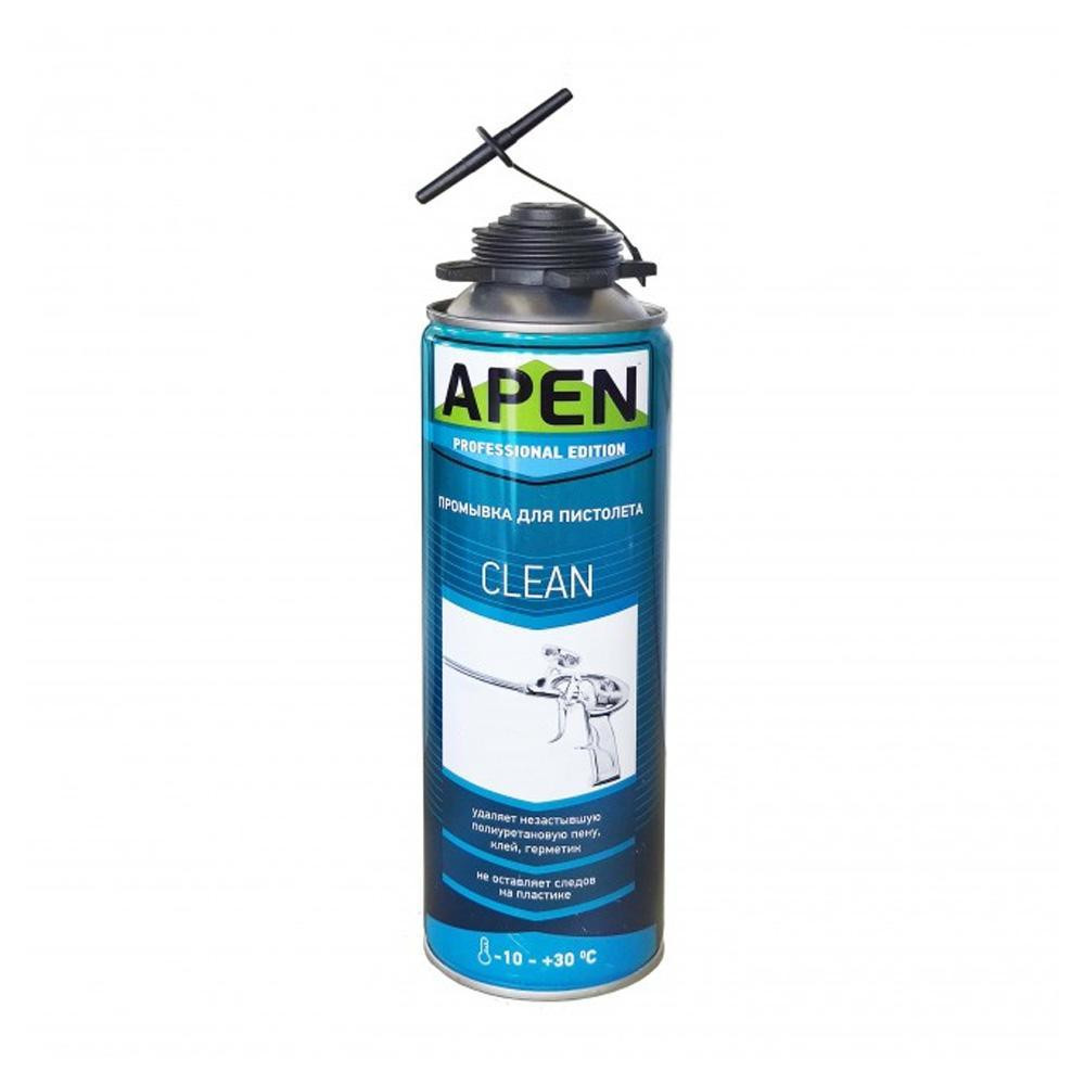 APEN CLEAN використовують для видалення незастившей піни з тканини, віконних рам, з пістолетів для піни. APEN CLEAN спеціально сконструйований для чищення пістолета для піни. При використанні очищувача натиснути спуск несколькo раз, що б очистити наповнювач і кінчик, очищувач забезпечений вентилем для пістолета, наприклад для видалення свіжої піни з адаптера пістолета. Пропеллант, використовуваний в очищувачі, не ушкоджує озоновий шар, але містить горючі гази, тому вимагає уважного використання. Для очищення пістолета для піни накрутити пістолет на бaллон і ретельно прочистити. Для видалення піни з тканини або інших речей використовувати прикріплений кінчик. Дотримуватися правил протипожежної безпеки, використовуючи APEN CLEAN.