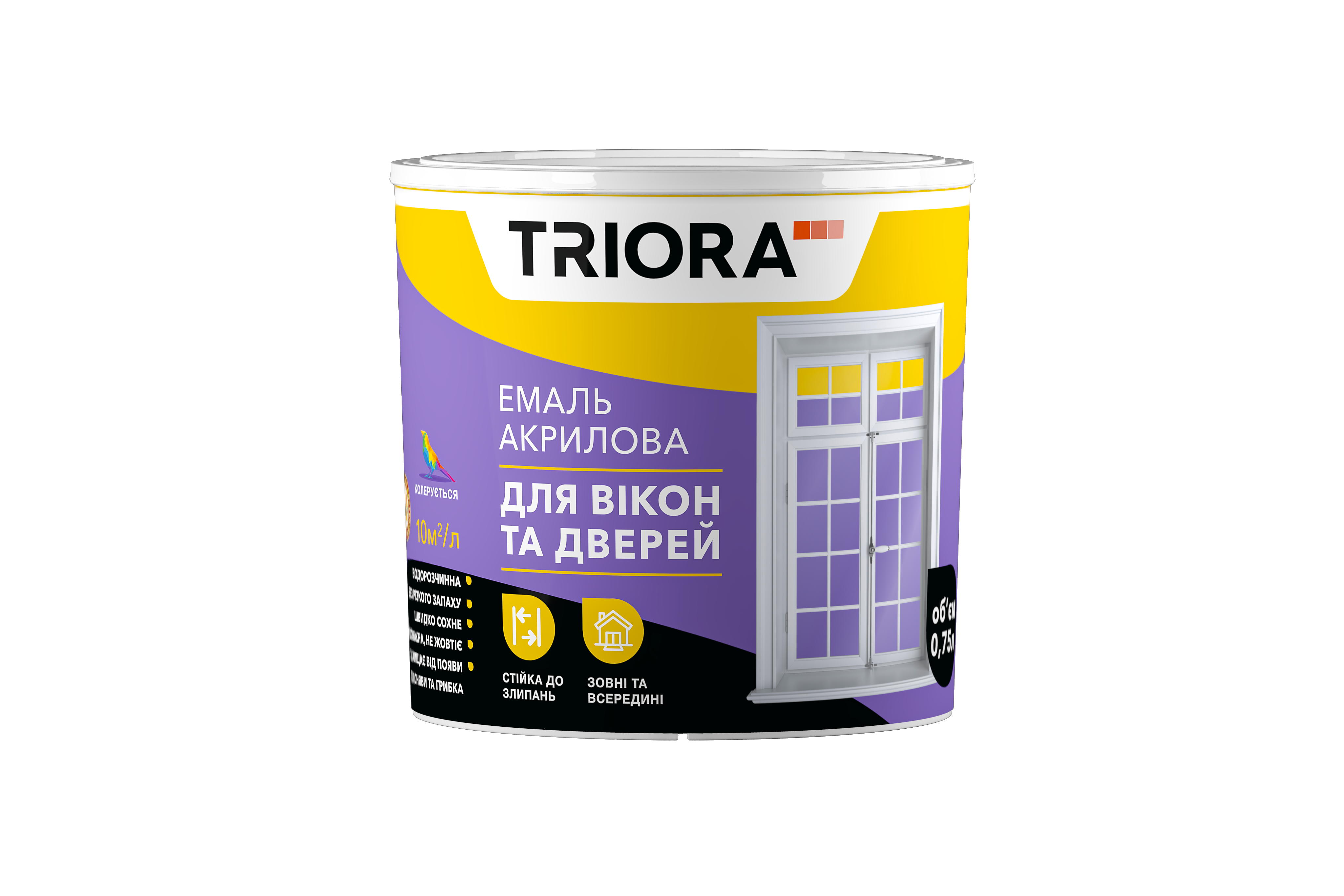 Емаль для вікон і дверей володіє істотною перевагою – вона зберігає ідеальний білий колір і з часом не жовтіє. Матеріал нешкідливий для оточуючих, не має неприємного запаху, відмінно лягає на старі алкідні покриття. Пофарбовані поверхні не злипаються, захищає від проникнення вологи і має антисептичні властивості. Дуже добре підходить для фарбування будь-яких дерев’яних поверхонь (іграшки, меблі, дитячі меблі, вікна, двері, дерев’яні панелі), крім підлоги. Випускається в білому кольорі, який колеруется в пастельні тони по віялу TRIORA COLLECTION, NCS; TR-база прозора колеруется, в насичені кольори RAL і NCS.