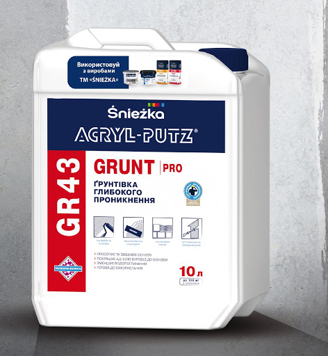 ҐРУНТІВКА ГЛИБОКОГО ПРОНИКНЕННЯ ACRYL-PUTZ® GR43 ҐРУНТ ПРО підвищує міцність поверхневого шару, покращує адгезію, а також забезпечує правильне висихання нанесених пізніше виробів. Запобігає занадто швидкій віддачі води до основи. Утворює прозорі покриття, проникні для водяної пари.